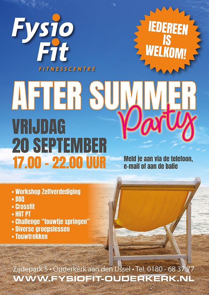 Vrijdag 20 september organiseren wij een after summer party! Iedereen is welkom vanaf 17.00 uur. De avond duurt tot 22.00 uur.